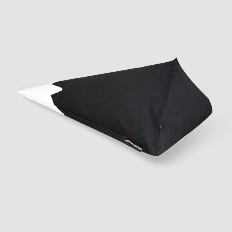 La hauteur du coussin est de 45 cm et sa base est triangulaire de côtés 32x24x24 cm.